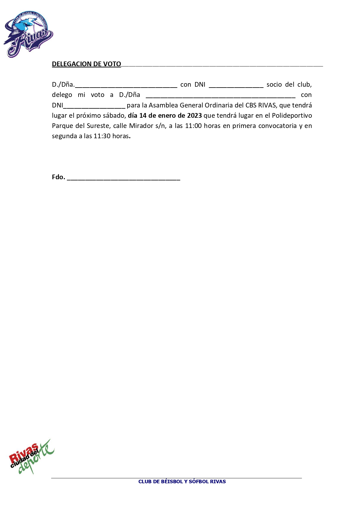 Por razones ajenas a nuestra voluntad y a la espera de resolver un tema importante con la Federación se aplaza la convocatoria a la Asamblea General de socios del Cbs Rivas realizando nueva convocatoria que se adjunta.